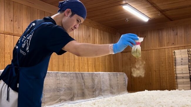 To ensure the spores evenly coat every grain of rice, they are sprinkled in three stages, with the rice being turned and mixed between each step.