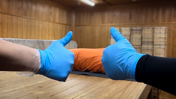 種切りが終わったら中央に寄せ、明日まで保湿・保温して麹菌の増殖を待ちます。