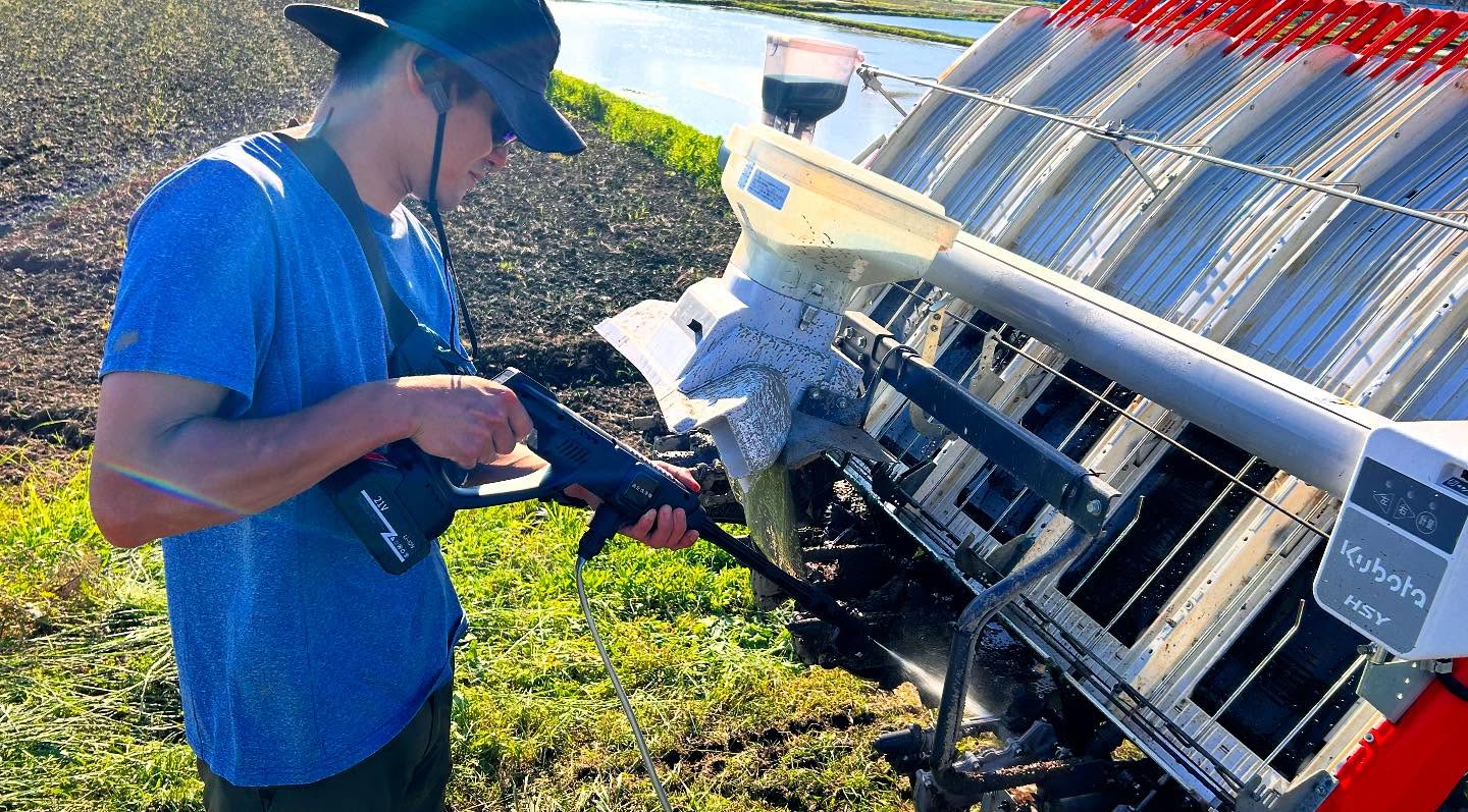 Each time we switch rice varieties, we carefully clean the rice transplanter — but this year, we’ve made it easier with a cordless high-pressure washer. Game changer!