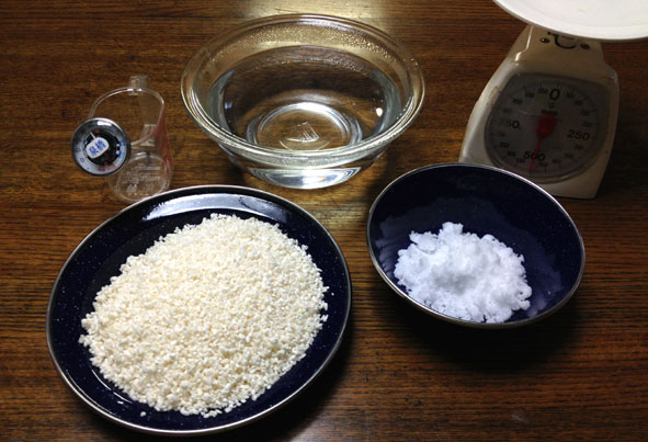 米こうじ200g、冷ました湯400ml(60℃以下、熱湯は絶対に×)、食塩65g