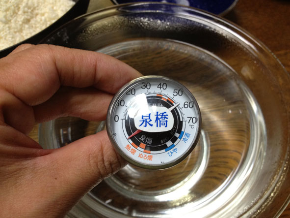 (写真)酒屋だけに「お燗メーター」で温度を計ります。実は、麹の酵素を働かせるのに最適な温度は55℃ぐらいなんです。これは、酒造りに欠かせない酵母菌(イースト)を培養するための麹エキス(要は甘酒)を一晩で作るときの温度帯なのです。