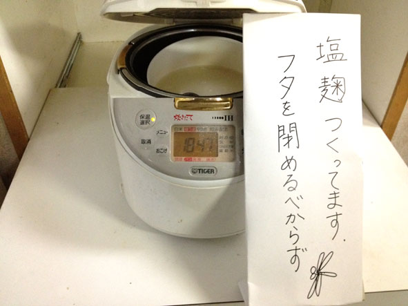 ・ここでのポイントは、炊飯器のフタを閉じないでください。閉じると中の温度が上がり過ぎて麹の酵素が活性を失ってしまうことがありますので。