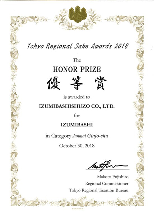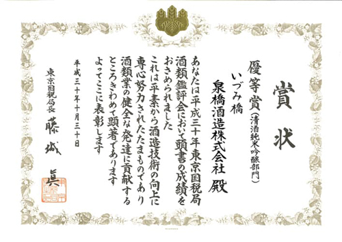 いづみ橋が優等賞受賞 @東京国税局 H30酒類鑑評会
