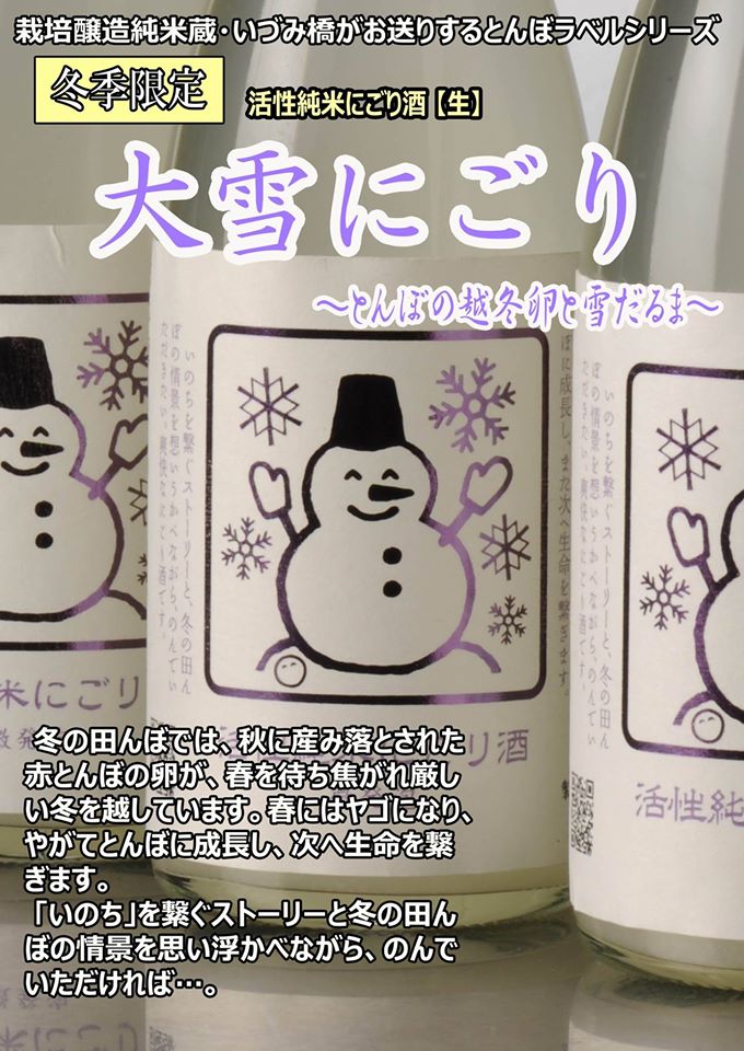2015/12/03 新酒第4弾の発売 活性にごり酒 とんぼの越冬卵と雪だるまラベル~大雪にごり~ 新酒第4弾の発売です。 とんぼの越冬卵? よくこのお酒は「雪だるま」と言われますが、主役は、足元のとんぼの卵です。赤とんぼなどの卵は田んぼでそのまま越冬しているそうです。そんな物語が楽しいお酒です。 お酒が生きていますので、時間の経過とともに(ビン内二次発酵)シュワシュワして参ります。開栓時には十分注意してくださいませ。純米酒 活性にごり酒。 2800円(1800ml)、1400円(720ml)572円(250ml) すべて税抜き価格です