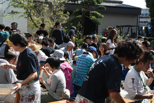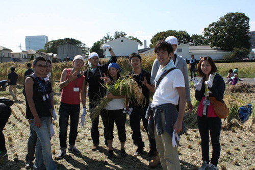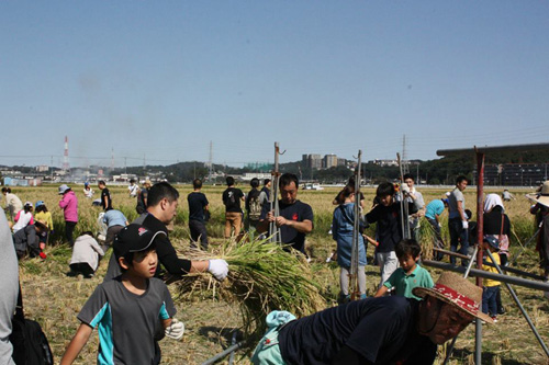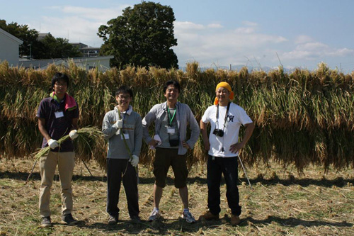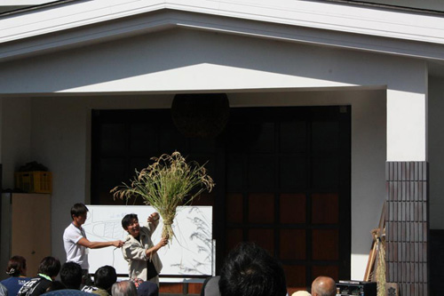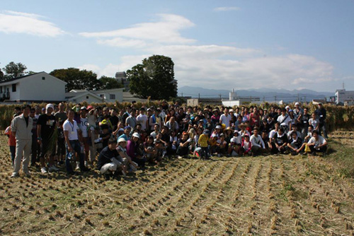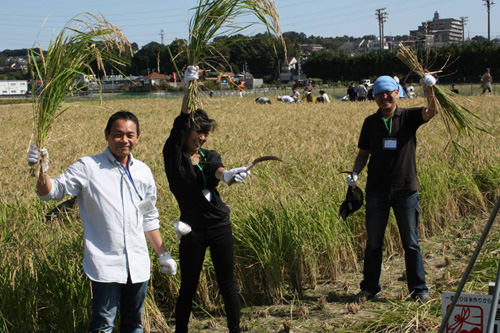 2013/10/14 10/13 第18回稲刈り会を開催しました 10/13(日) 快晴 今年18年目となる稲刈り&収穫祭をおかげさまで無事終えることが出来ました。暑いぐらいの陽気の中、秋のひとときを皆様と過ごすことが出来ました。 3連休の中日で、かつ、前日の営業明けの早朝から、多くの酒販店さま、飲食店さまにご参加頂きました。ほとんど寝ていないお客様も随分と多いようでした。皆様、ありがとうございました。