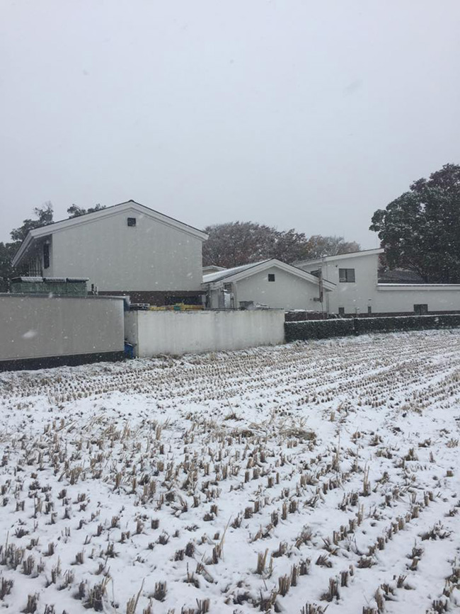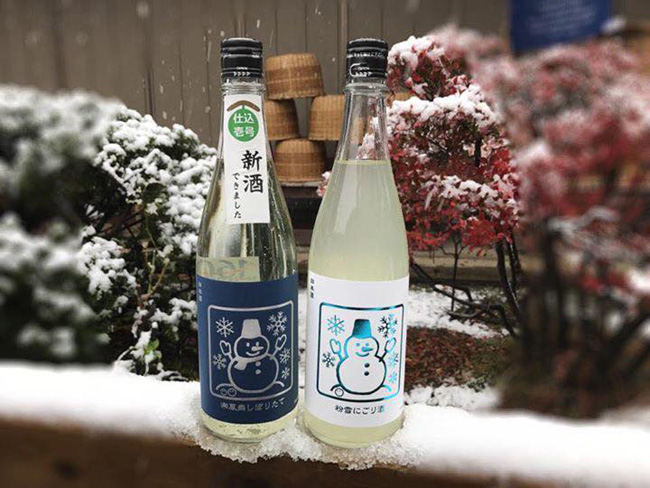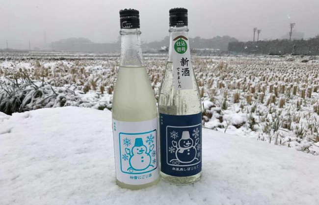 2016/11/24 11/24雪です。とんぼの越冬卵と雪だるまラベル2種 ホントに雪です! 滅多にない11月の雪景色をバックに。「とんぼの越冬卵と雪だるまラベル」、楽風舞しぼりたてと山田錦のうすにごりの二種類、絶賛発売中。11/24/2016