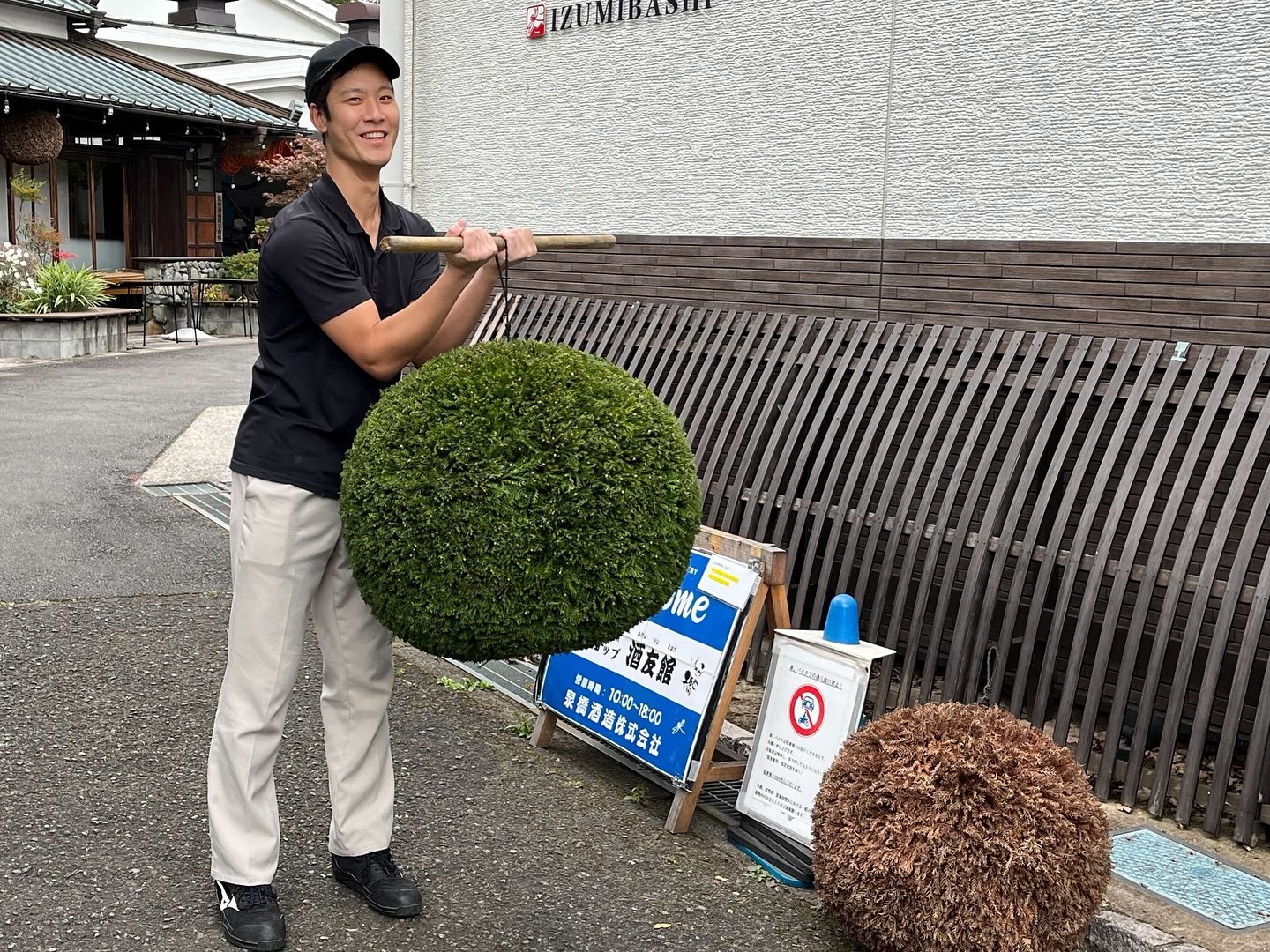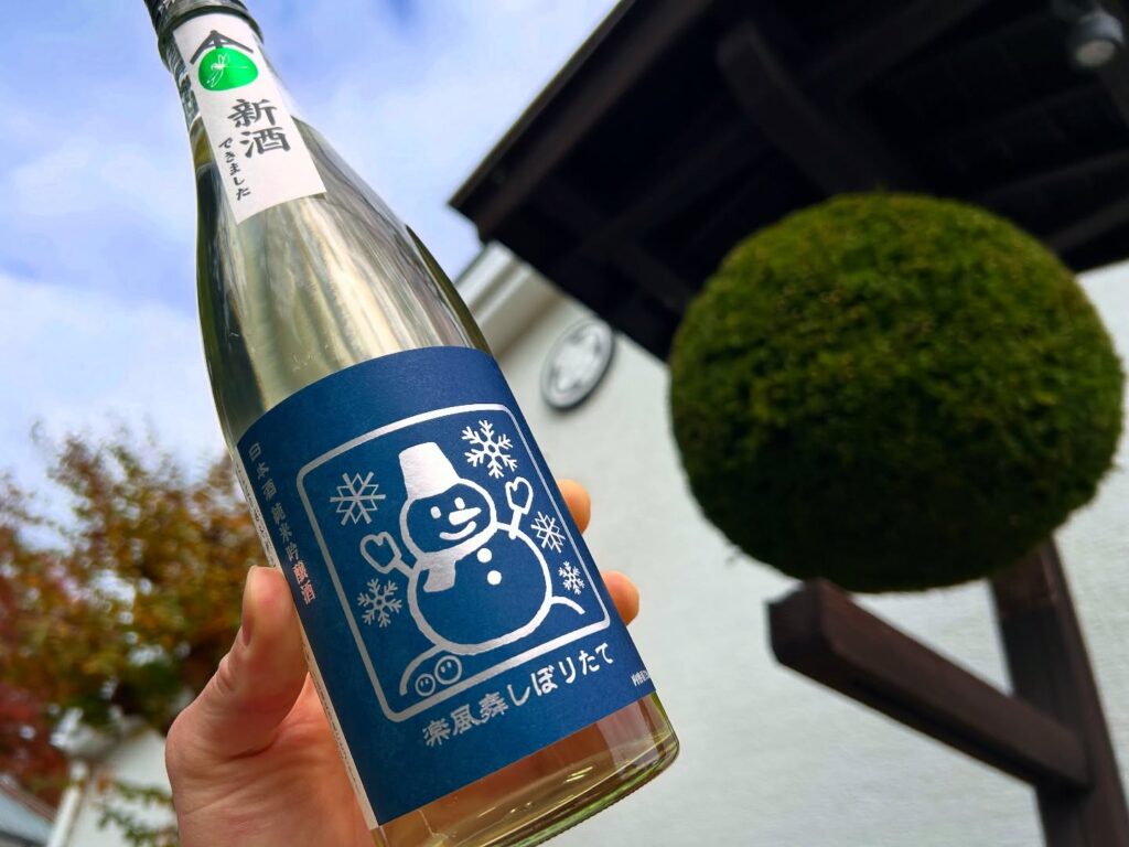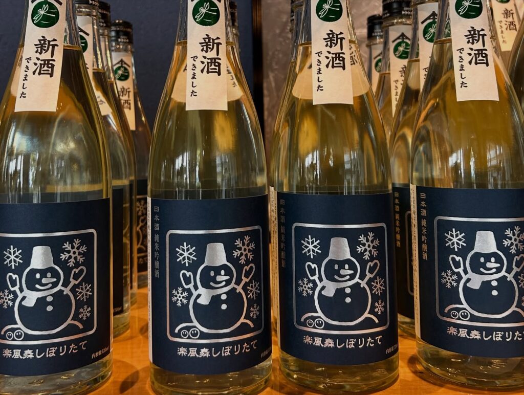 2025/11/09 新酒の発売と新しい杉玉。 新酒の第1弾の発売です。 杉玉(酒林とも)を新たにしました 新酒ができましたの合図として緑々しい杉玉をかかげます。 昔は杉玉の枯れる色付きが新酒の熟成度合いをあらわしていたとも。 新酒「しぼりたて楽風舞」 〜とんぼの越冬卵と雪だるまラベル〜