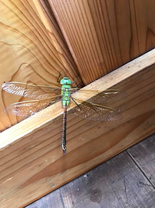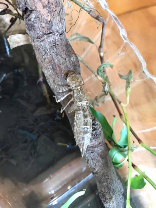 2019/08/26 8/26 ついにヤゴがトンボになりました! ついに!ギンちゃんの旅立ちの日が! ヤゴからトンボへ、直売所のペットボトル製ヤゴハウスで、新鮮な泥や生きたドジョウを与えられてスクスク育ったギンヤンマが羽化しました。感動です。 まだ羽根が完全に乾いていないので、お店の中でじっと待っています。 とんぼ 脱げガラ やご(蔵で1ヶ月ほど飼育していました)