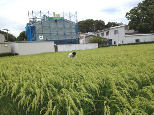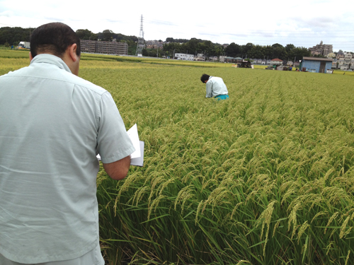 (写真)神奈川県農業技術センターの藤田さん(奥)とJAさがみの検査委員の藤田さん(手前)。酒米の田圃は、稲穂ばかりが良く見えるのが特徴。