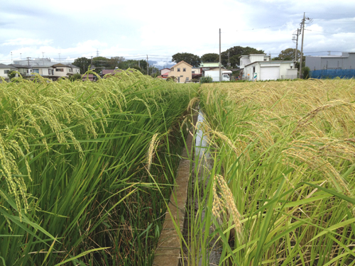 (写真)どちらの品種も今年の6月上旬に田植えしたのですが、9/19現在ではこんなに成長具合が違います。左は晩稲(おくて)種、右の品種は早稲(わせ)種なのです。
