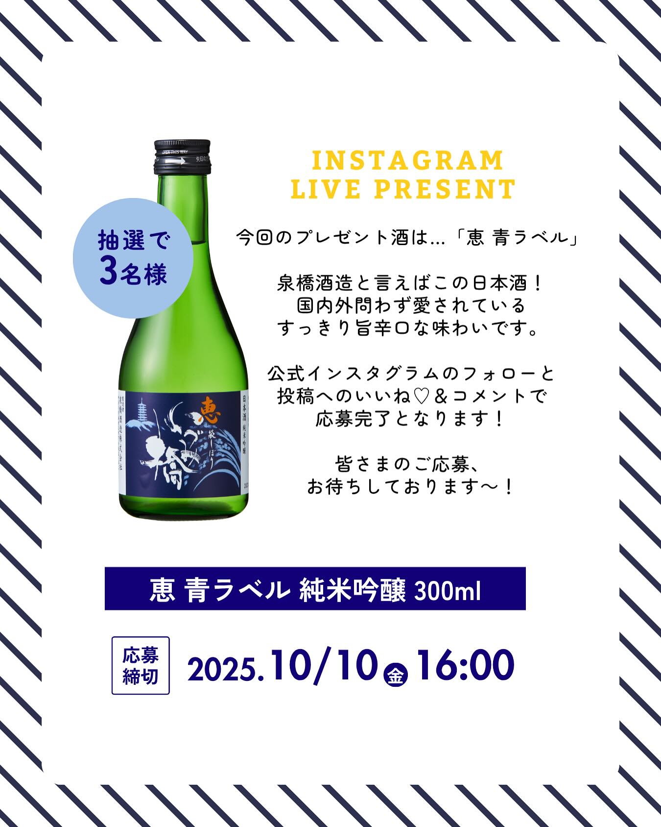 今回は3名様を対象に泉橋酒造を象徴する「恵 青ラベル 純米吟醸 300ml」をプレゼント!