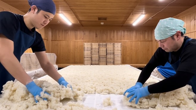 After tane-kiri is complete, the rice is gathered into the center and left to maintain moisture and temperature until the koji mold proliferates by the next day.