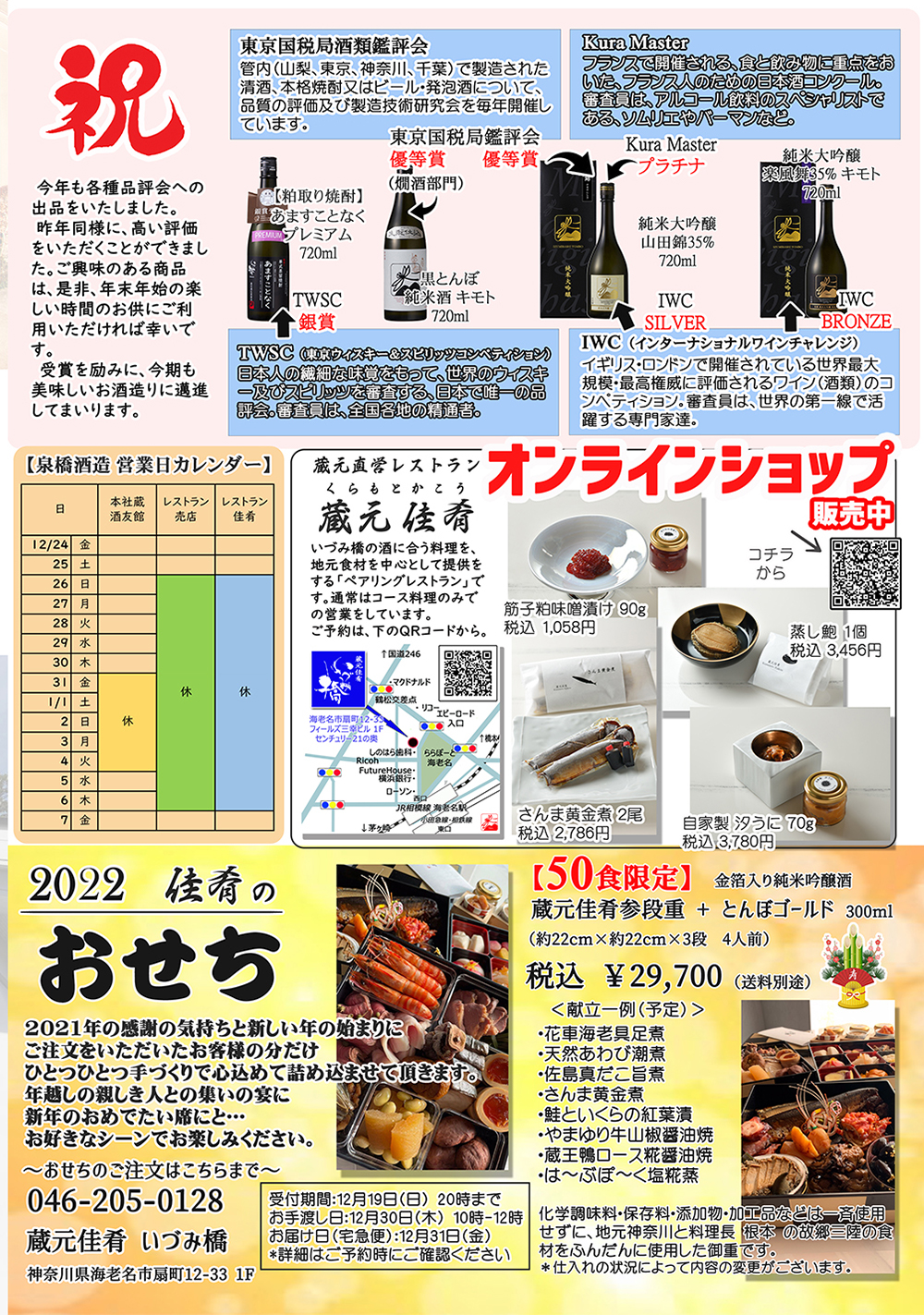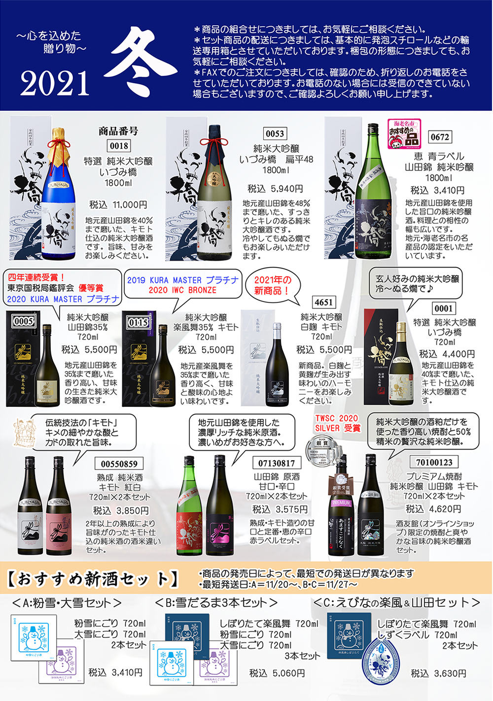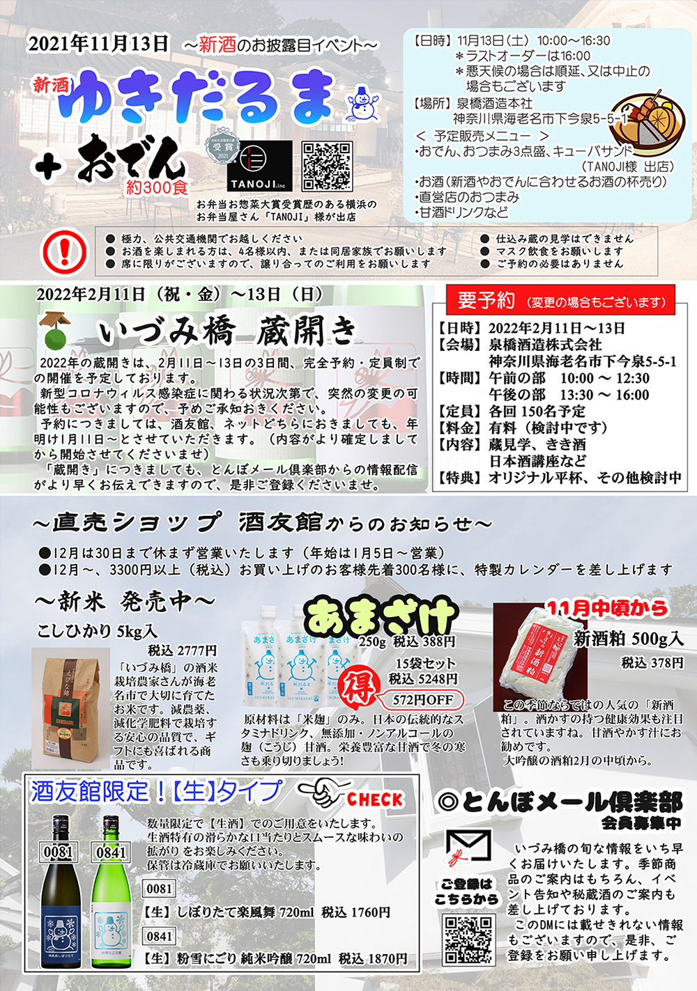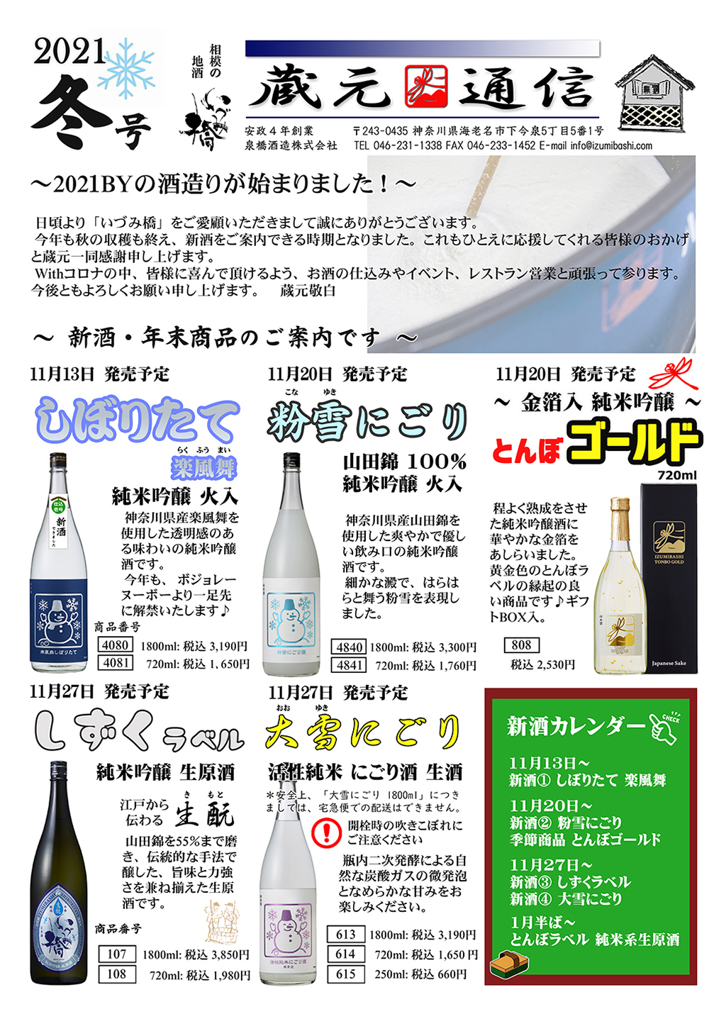 2021/11/10 【冬パンフレット】蔵元通信2021冬号~新酒のお知らせ~ 以下は、年末の蔵元通信です(No.1~4) 詳しくは、泉橋酒造までお問合せください。 【1ページ】 【2ページ】 【3ページ】 【4ページ】