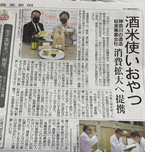 コロナ禍で出荷が減った日本酒の原料となる酒米を給食に使い、安田物産様と泉橋酒造が地元農業を守って行こう、という取り組みです。