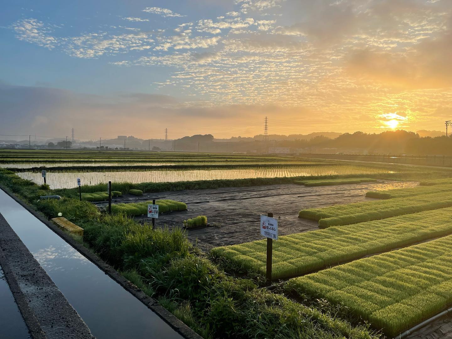 植えたばかりの田んぼに映る朝日がとても綺麗…