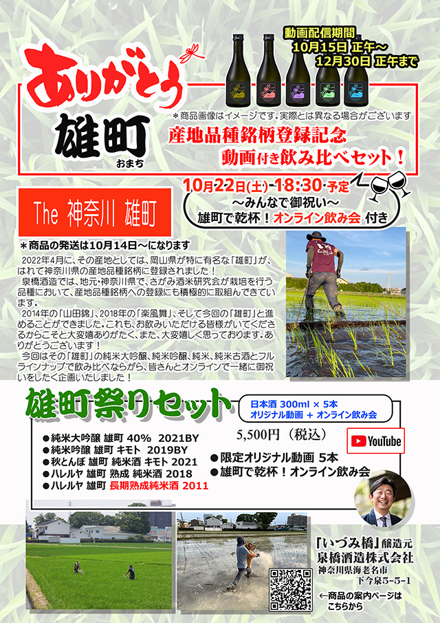 今回はその「雄町」の純米大吟醸、純米吟醸、純米、純米古酒とフルラインナップで飲み比べならがら、皆さんとオンラインで一緒に御祝いをしたく企画いたしました!