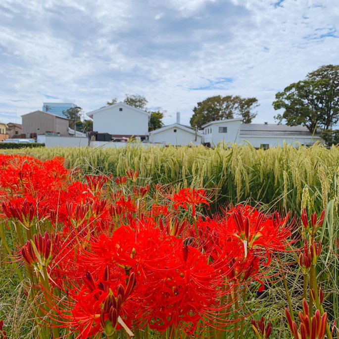 【彼岸花が見ごろです!】 鮮やかな赤と稲穂のコントラストを楽しめるのは今...