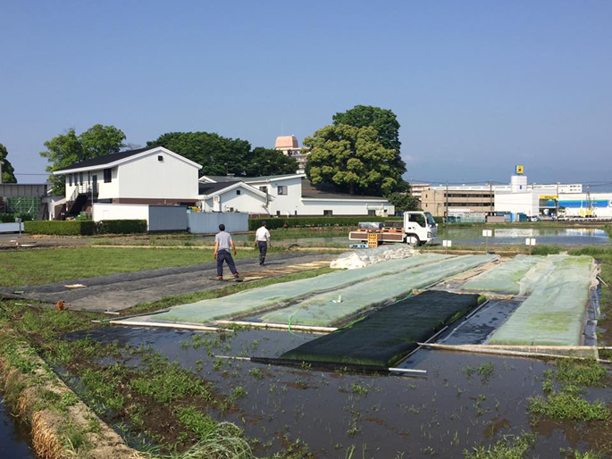 5/23朝。苗作り 山田錦の苗箱を広げています。苗箱の数は泉橋酒造の自社...