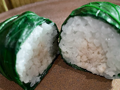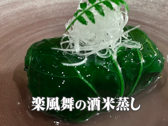 • 炊いた酒米を海老にかぶせて、小松菜で包み、中心部が温まるまで蒸し釜で蒸します。