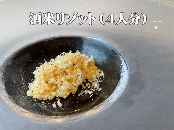 • 酒米を洗ったらしっかり水気をきり、手早くオリーブオイルを絡める事で、酒米の吸着を防ぎ、パラパラで、サラサラの酒米一粒、ひとつぶの食感を愉しむことができる