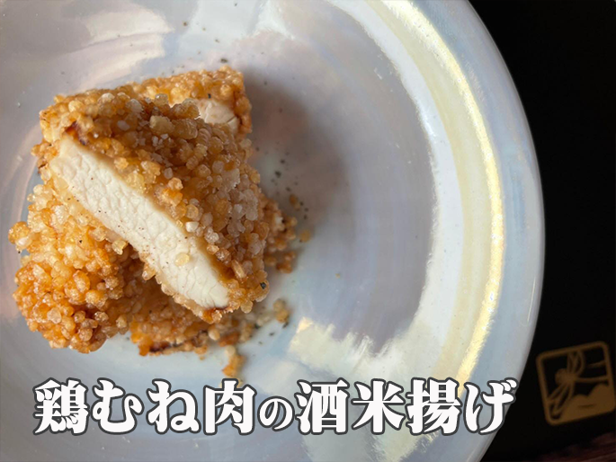 ・また、浸水させていない生のままの酒米をフライパンできつね色になるまで煎り、すり鉢摺り粉末にした酒米を直接お好みの食材に付けて揚げても美味。