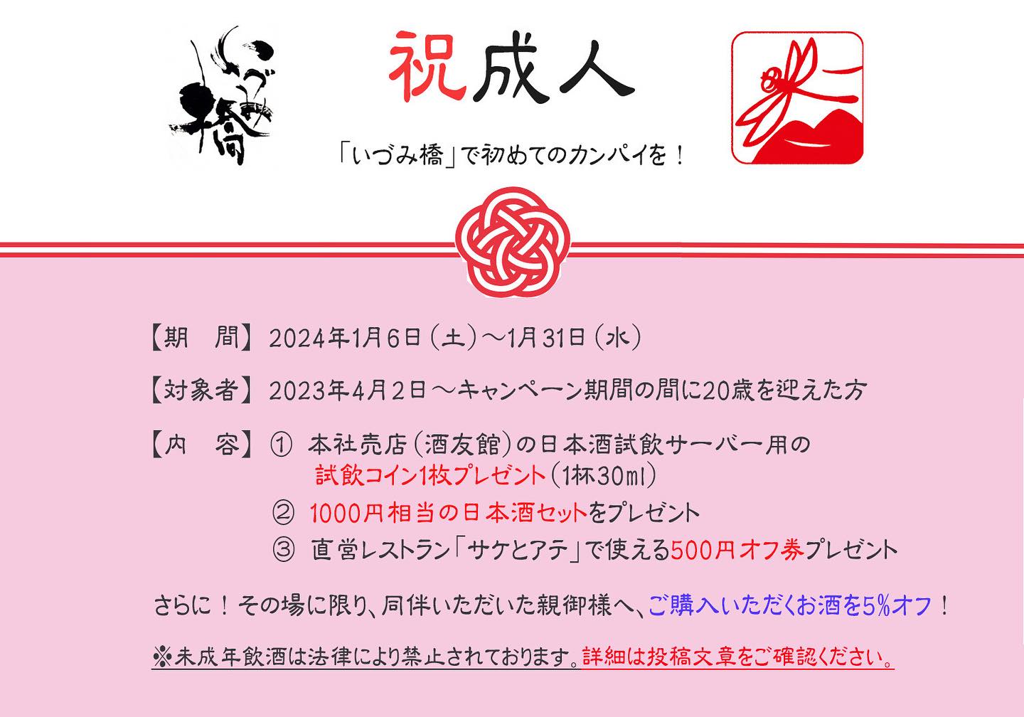 これを機会に、新成人の皆様に「いづみ橋」を知っていただくと共に、奥深い日本酒の世界への第一歩として頂けると幸いです。