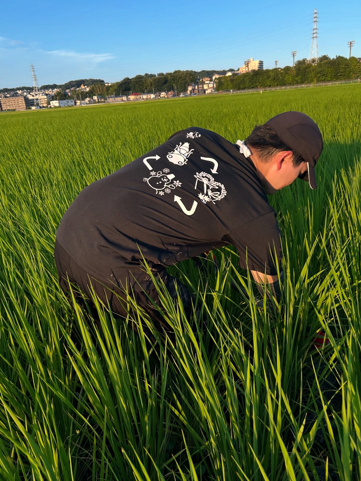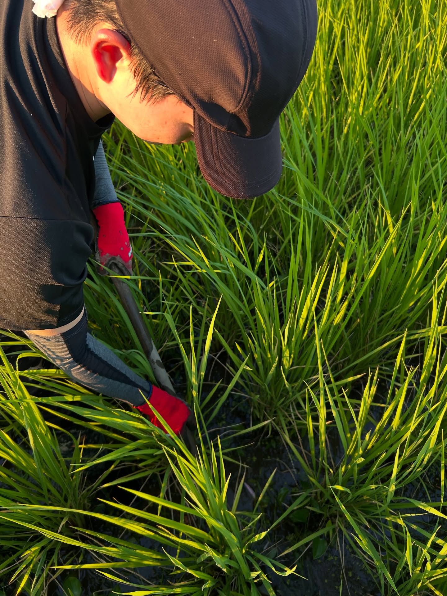 After the mid-season drainage, the soil in the rice field becomes firm and surprisingly easy to walk on. Walking through the field allows me to observe the growth of the rice up close, which is another benefit. In this Omachi rice field, where no pesticides are used, the battle against weeds continues until the very end.