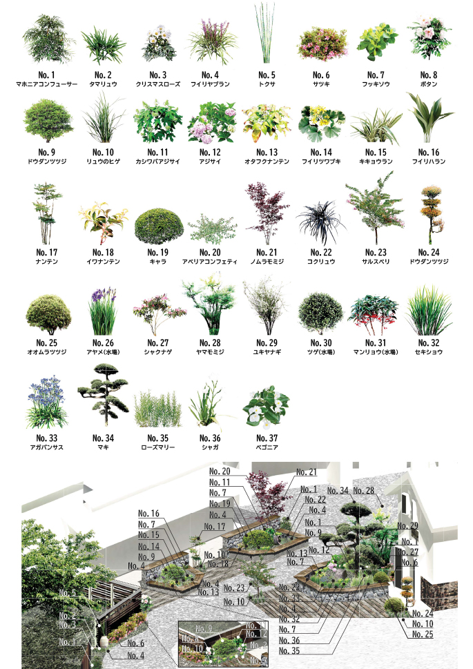 ■照らす席の植栽について 季節ごとに楽しめるよう37種類に植栽で皆様をお迎えしております。