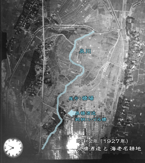 銘柄の由来となる「泉川」は、用水として泉橋酒造の敷地内を流れていたもので、この「泉川」と屋号「橋場」から銘柄名「泉橋」は名付けられています。しかしながら、昭和初期の土地改良事業により泉川は用水路へと変わりました。この辺りの地名は「上今泉」や「下今泉」「泉町」など「泉」と付くものがいくつかあります。