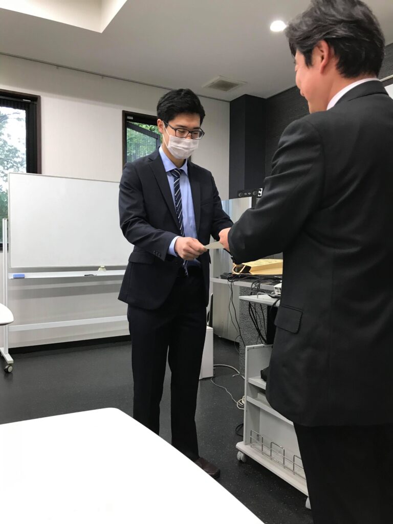 写真)マスク着用での入社式、悲しいことにお祝いの酒宴は開けませんでした。