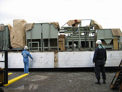 (写真)運ばれてきた組立前の精米機、田しか10トントラック2台分だったような