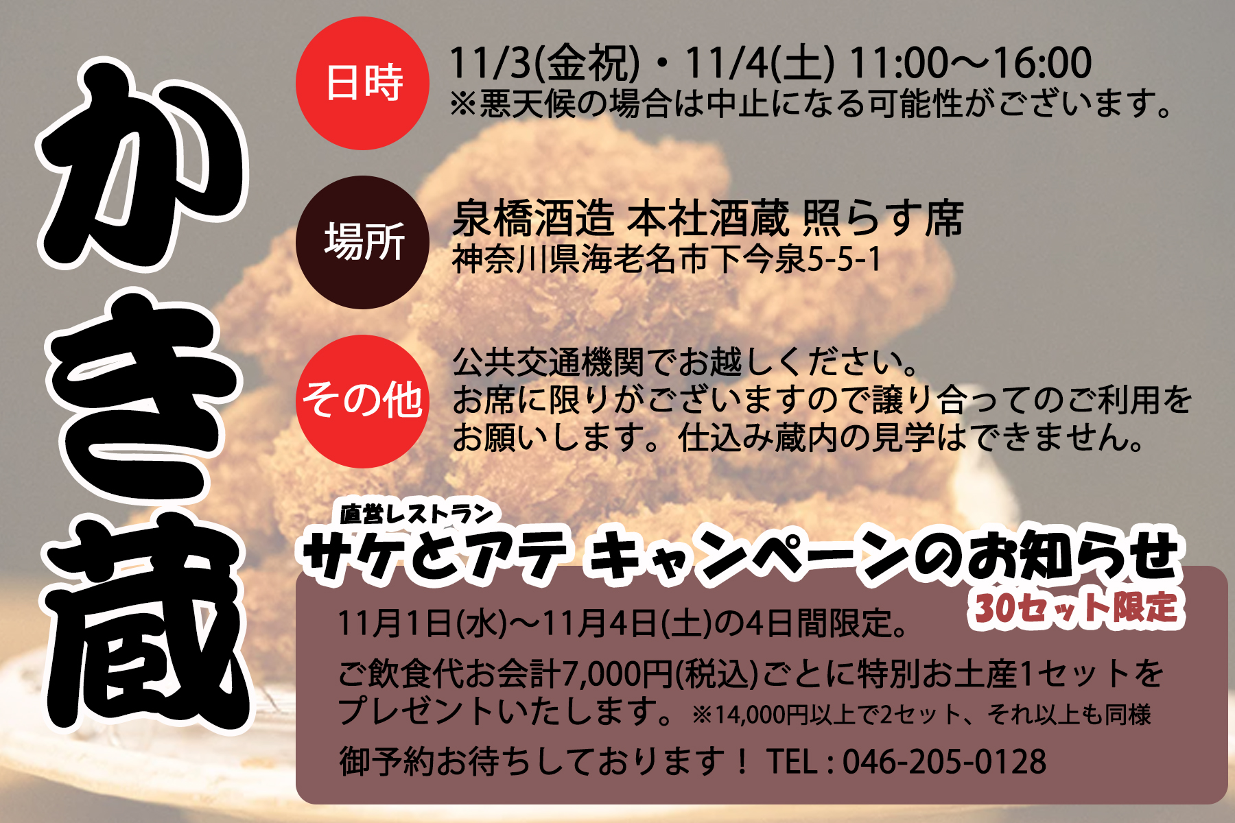2023/10/26 お知らせ 【イベントお知らせ】かき蔵 11/3(金祝)・11/4(土)の2日間、泉橋酒蔵の照らす席にて「かき蔵」を開催いたします! 各日11:00~16:00、お酒と牡蠣フライ・蒸し牡蠣を用意してお待ちしております。 詳細は イベントページ をチェック!
