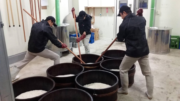 (写真)伝統的でかつ技術力の必要な生酛造りの山おろしの様子