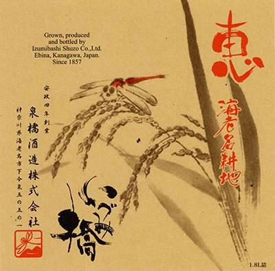 海老名耕地とは、古代2000年前より連綿と続く地元海老名の田んぼのことを昔から”海老名耕地(えびなごうち)”と呼んでいます。地元で栽培した山田錦を敢えてたくさん削らず(精米歩合80%、玄米の外側20%しか削らないということ)、大地の太陽、風、水、土壌を自然に楽しめるような酒にしたいと思い、海老名耕地と名付けさせて頂いています。デザインは、稲穂に留まる赤とんぼを墨絵で表現しています。